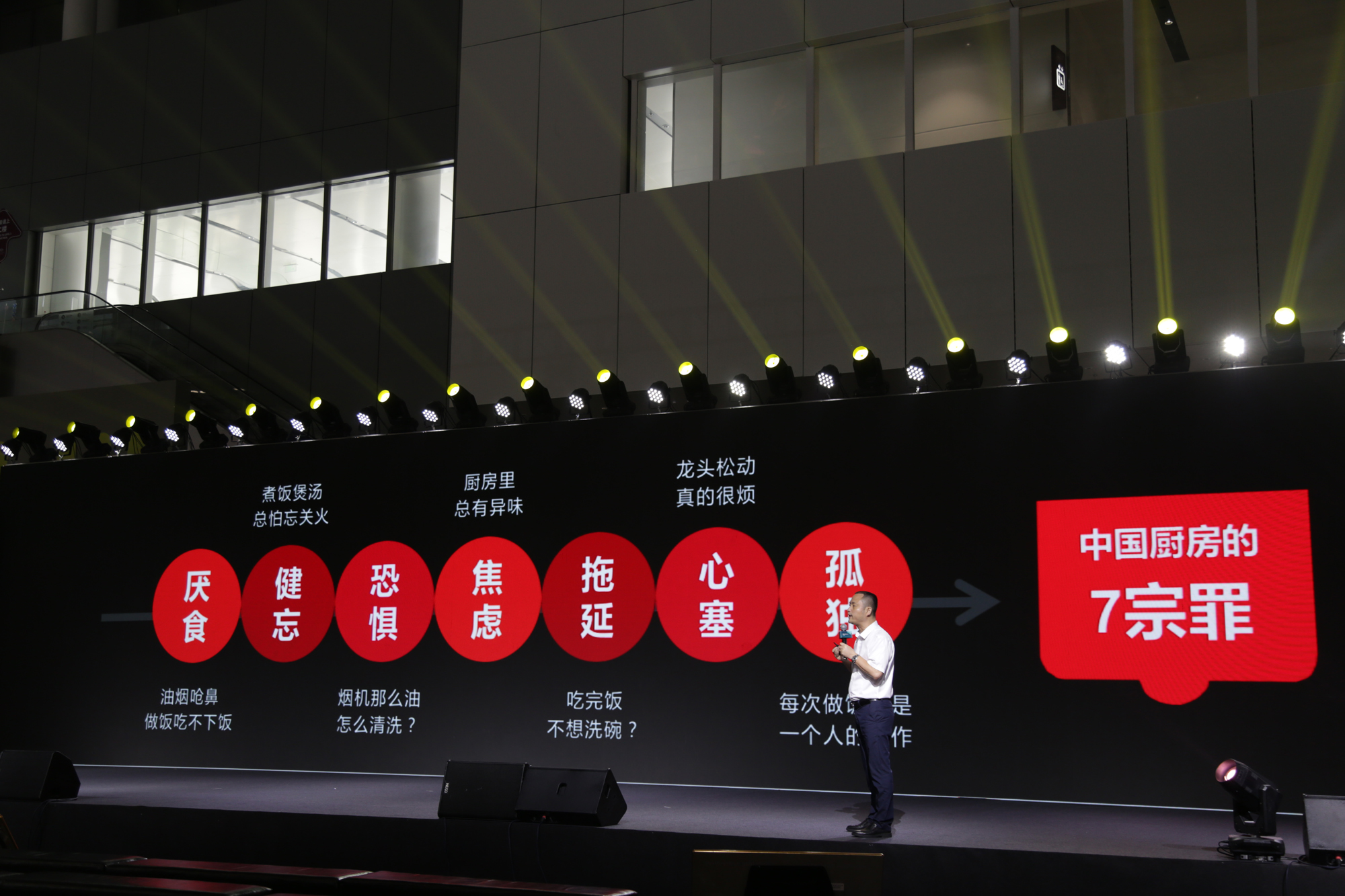 他提到目前中国厨房存在厌食、健忘、恐惧、焦虑、拖延、心塞及孤独7大负面情绪,而这些问题主要源于不合适、不好用的产品体验。