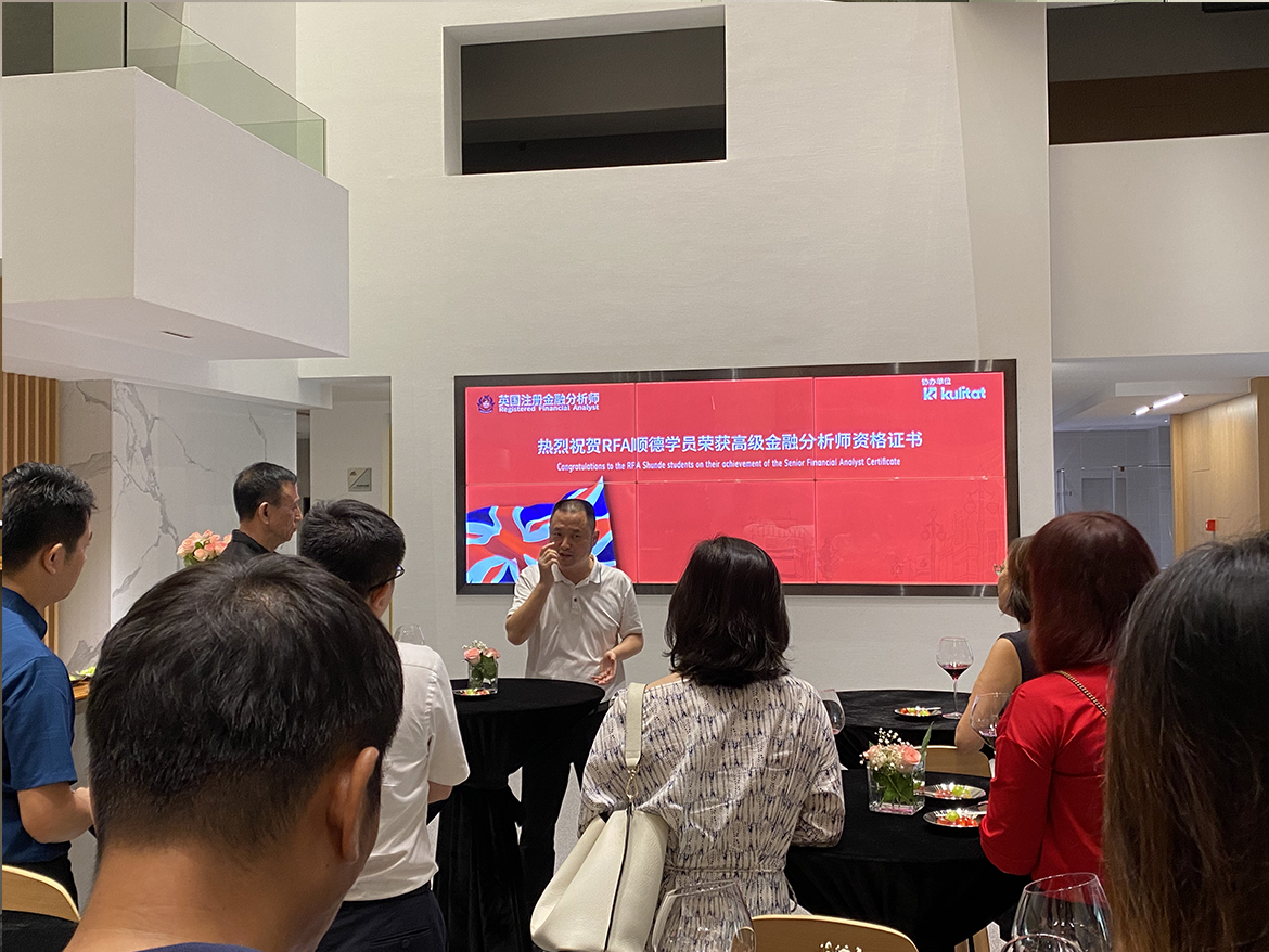 9月19日,RFA英国注册金融分析师—顺德首期学员颁证典礼在kulitat库灵图华南运营中心如期举行。活动期间,库灵图中华区总裁李林鸿先生为现场学员嘉宾们致以了热烈的欢迎和诚挚的问候,同时十分荣幸地邀请到了清华大学博士后、本科生导师——杨博士,为学员们颁发证书。