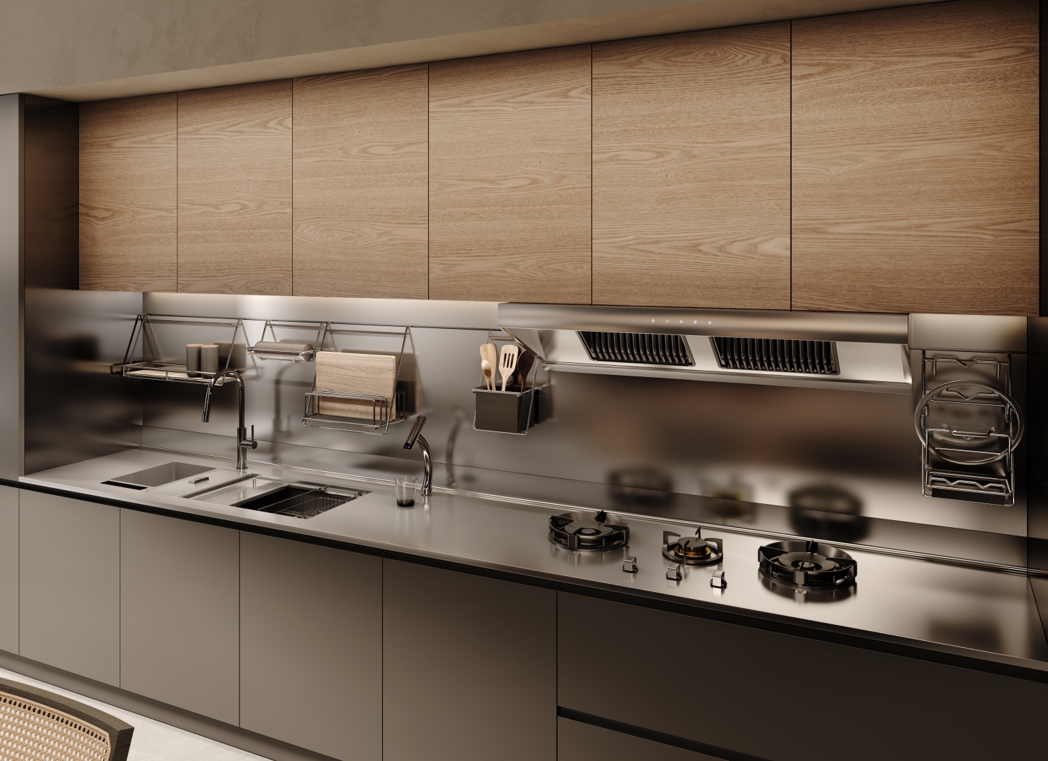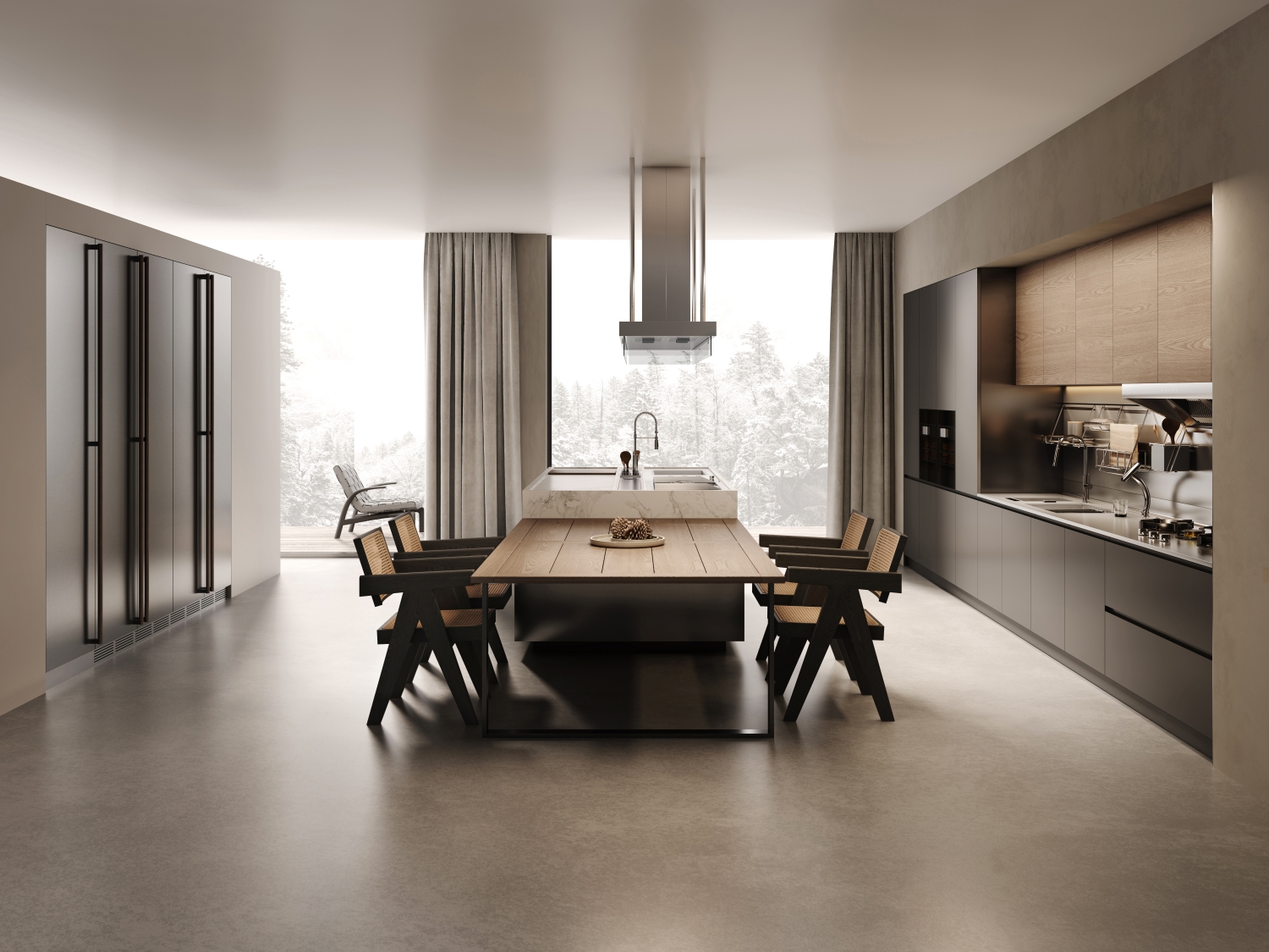 Clowzer「克洛兹」 追寻去繁就简却不失有序规整的设计旋律,承载家庭的温情纽带。餐厨一体化的简洁空间实现了厨房的实用性与设计艺术性的平衡,恰到好处的低调与高级,倾注着钢材、石材、木材的多重碰撞而带来的无限可能。